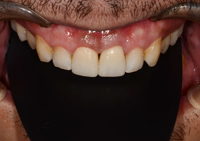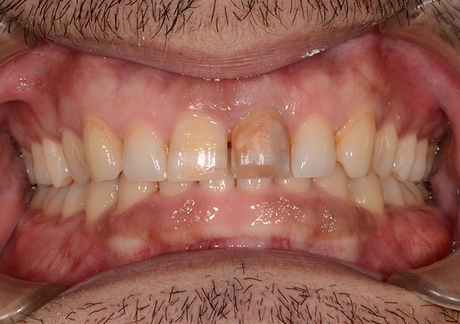 前歯部の変色と歯の形態をセラミッククラウンで審美的に整えたケース。